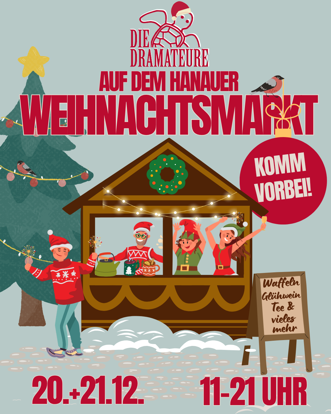 Kommt uns auf dem Hanauer Weihnachtsmarkt besuchen! Ihr findet uns am Sa, 20. & So, 21.12., jeweils 11 – 21 Uhr auf der Rathaus-Seite des Marktplatzes, direkt bei dm. Wir freuen uns auf ein weihnachtliches Beisammensein mit euch bei Waffeln, Glühwein, Tee und guter Laune!